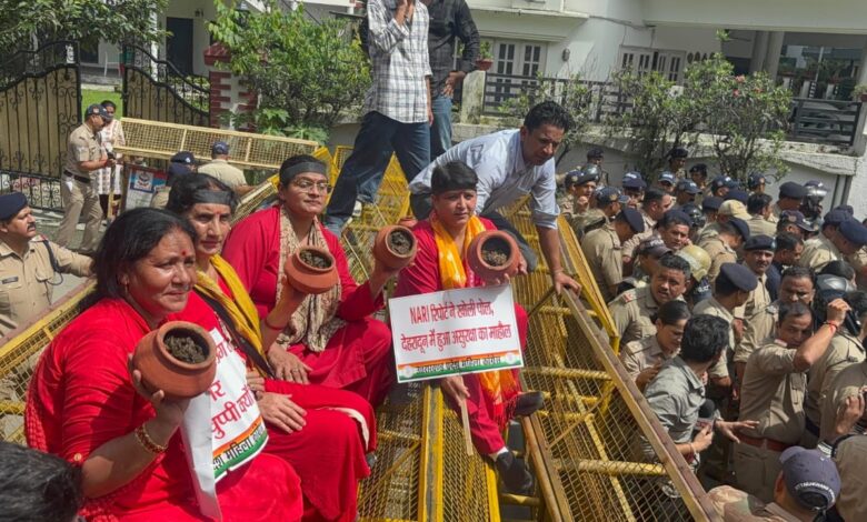 महिला सुरक्षा के मुद्दे पर महिला कांग्रेस कार्यकर्ताओं ने प्रदेश अध्यक्ष ज्योति रौतेला के नेतृत्व में भाजपा कार्यालय की ओर कूच किया। प्रदर्शन में “गोबर के कलश” और “गोमूत्र की शीशियां” लहराते हुए भाजपा सरकार के खिलाफ नारेबाजी होती रही।