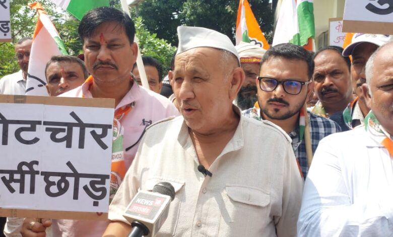 Rajkumar Dhiman, Dehradun: देशभर में मतदाता सूची में कथित हेराफेरी के खिलाफ कांग्रेस का विरोध अभियान सोमवार को रामनगर में जोरदार अंदाज में देखने को मिला। कांग्रेस कार्यकर्ताओं ने पूर्व विधायक रणजीत रावत के नेतृत्व में “वोट चोर-गद्दी छोड़, पेपर चोर-गद्दी छोड़” के नारों के साथ जुलूस निकालकर भाजपा सरकार पर सीधा हमला बोला।