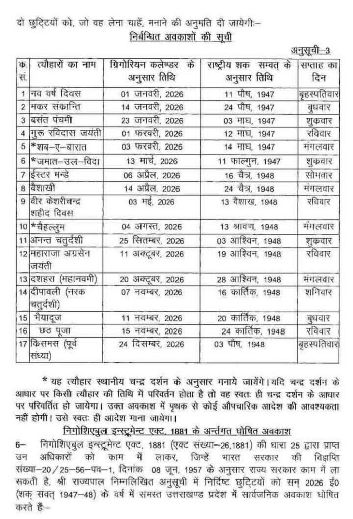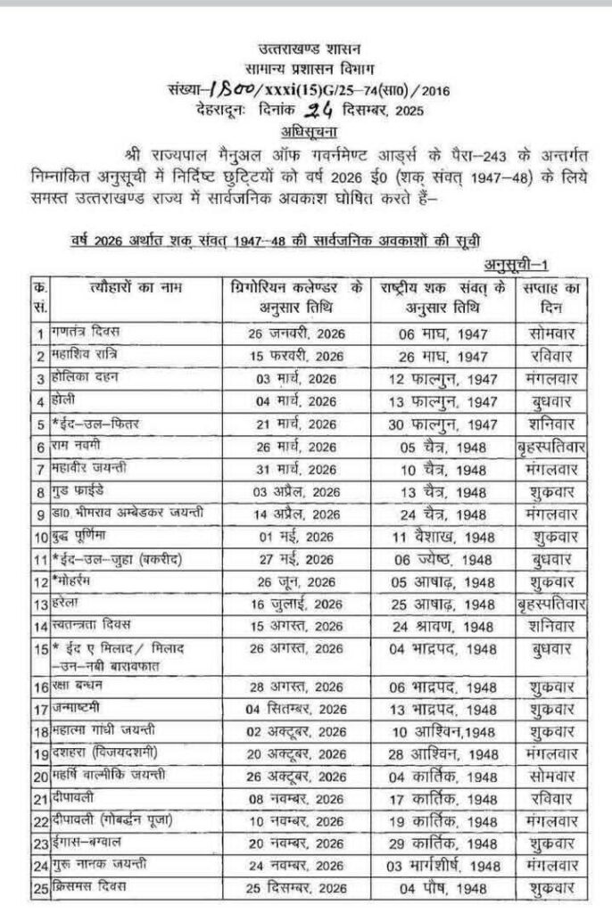 Rajkumar Dhiman, Dehradun: उत्तराखंड शासन के सामान्य प्रशासन विभाग के वर्ष 2026 के लिए सार्वजनिक अवकाशों की सूची जारी कर दी है। विभिन्न श्रेणी में नए साल के लिए 68 अवकाश घोषित किए गए हैं। हालांकि, 07 अवकाश रविवार के दिन आ रहे हैं।