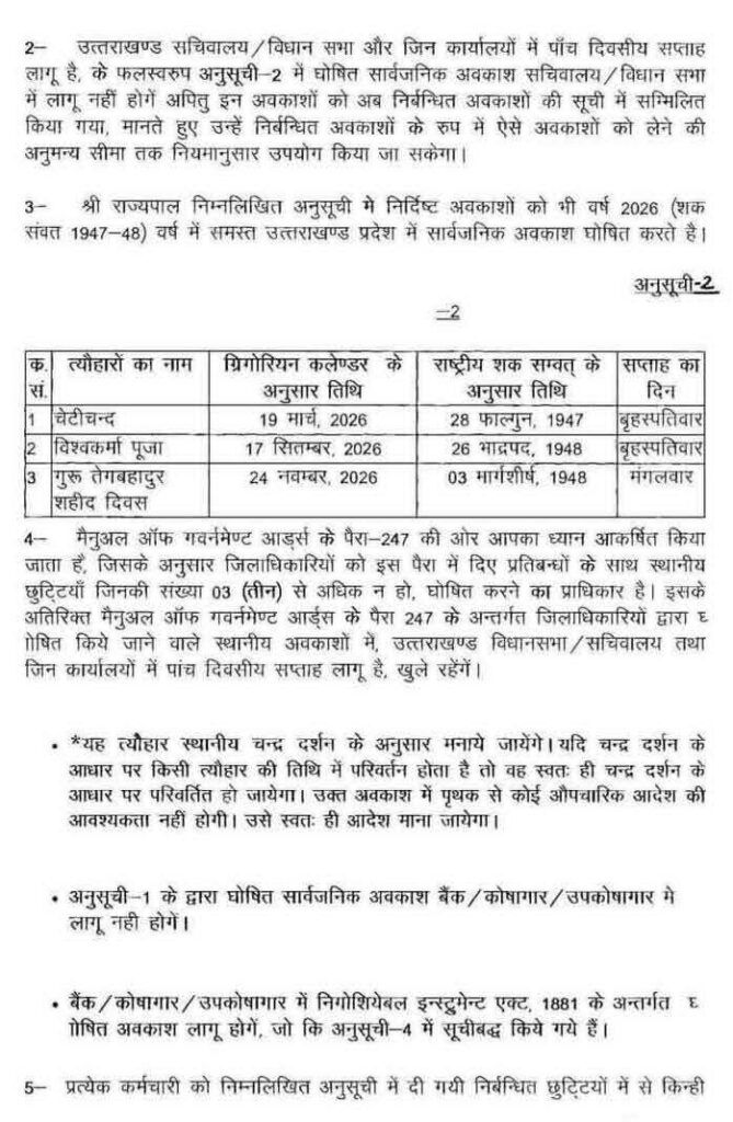 दूसरी तरफ अनुसूची दो में 03 अवकाश दर्ज हैं। हालांकि, इनका लाभ उन कार्यालयों को नहीं मिलेगा, जहां पांच दिवसीय सप्ताह की व्यवस्था लागू है।