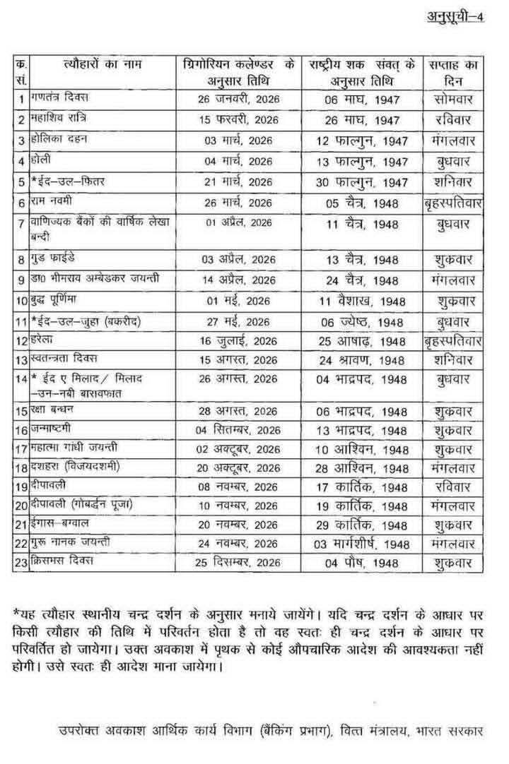 वर्ष 2026 के अवकाशों की सूची जारी, रविवार को पड़ रहे 07 अवकाश