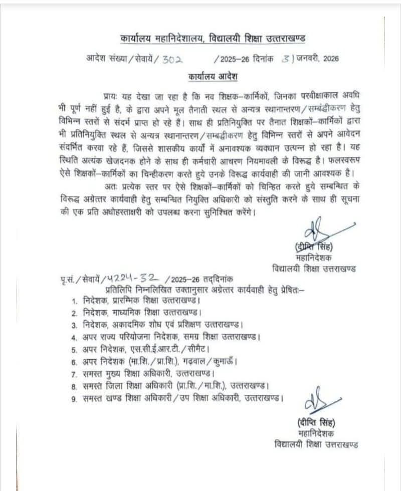 महानिदेशालय द्वारा 3 जनवरी 2026 को जारी कार्यालय आदेश में कहा गया है कि ऐसे कई मामले सामने आ रहे हैं, जिनमें नवनियुक्त शिक्षक–कर्मचारी अपने मूल तैनाती स्थल से अन्यत्र स्थानांतरण या सम्बद्धीकरण के लिए विभिन्न स्तरों पर दबाव बना रहे हैं।