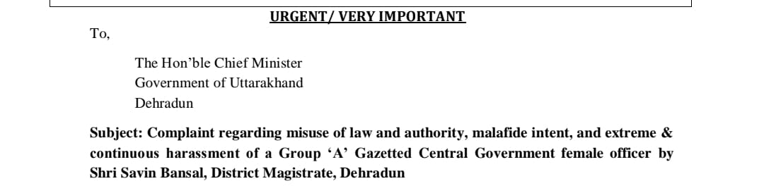 Rajkumar Dhiman, Dehradun: उत्तराखंड की राजधानी देहरादून में एक सीनियर क्लास वन महिला ऑफिसर के उत्पीड़न के गंभीर आरोप लगाने वाला एक पत्र सामने आया है। जिसमें एक तरफ केंद्र सरकार (रक्षा मंत्रालय) की वरिष्ठ अधिकारी क्लेमेनटाउन कैंट बोर्ड की सीईओ अंकिता सिंह पीड़ित के रूप में हैं तो उनके उत्पीड़न के आरोप जिले के सबसे बड़े अधिकारी जिलाधिकारी (डीएम) सविन बंसल पर लगे हैं। पत्र में डीएम बंसल पर कानून के दुरुपयोग, सत्ता के अनुचित प्रयोग और एक केंद्रीय सेवा की महिला अधिकारी के उत्पीड़न के गंभीर आरोप जड़े गए हैं। यह शिकायती पत्र मुख्यमंत्री पुष्कर सिंह धामी और मुख्य सचिव को भेजा गया है। साथ ही शिकायत की प्रति राज्यपाल, राष्ट्रीय महिला आयोग और अन्य को भी भेजी गई है। हालांकि, जिलाधिकारी सविन बंसल ने जनगणना की अति आवश्यक बैठक में दो बार अनुपस्थित पाए जाने के क्रम में की जा रही कार्यवाही को इस शिकायत से जोड़कर बताया।
