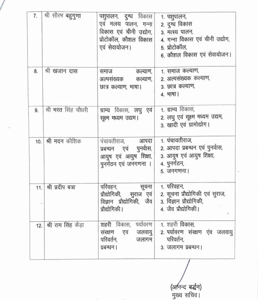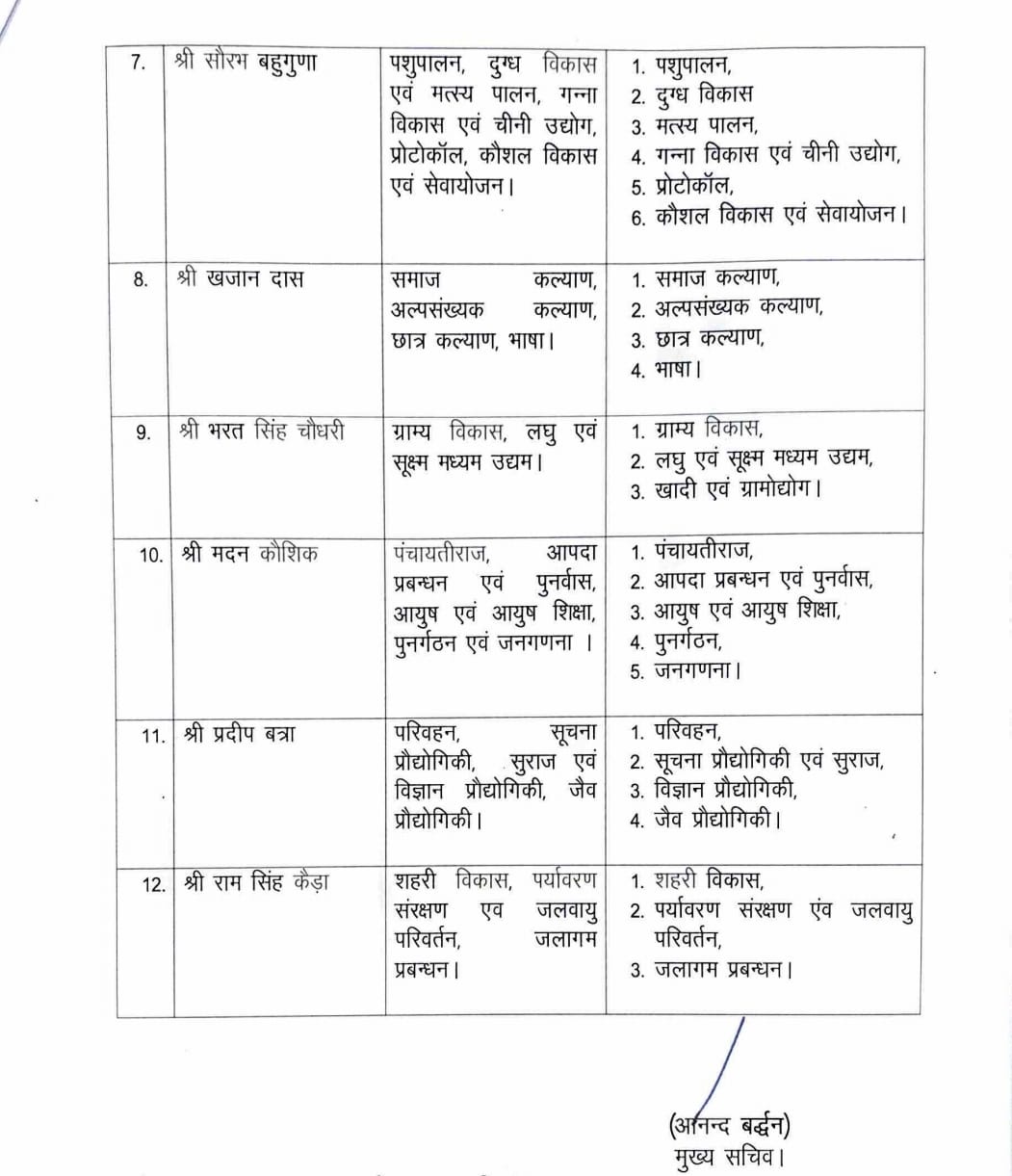 त्रिवेंद्र सरकार में आवास और शहरी विभाग का जिम्मा संभालने वाले मदन कौशिक को पंचायतीराज, आपदा प्रबंधन जैसे विभाग दिए गए हैं। वहीं, प्रदीप बत्रा को परिवहन जैसा अहम विभाग दिया गया है।