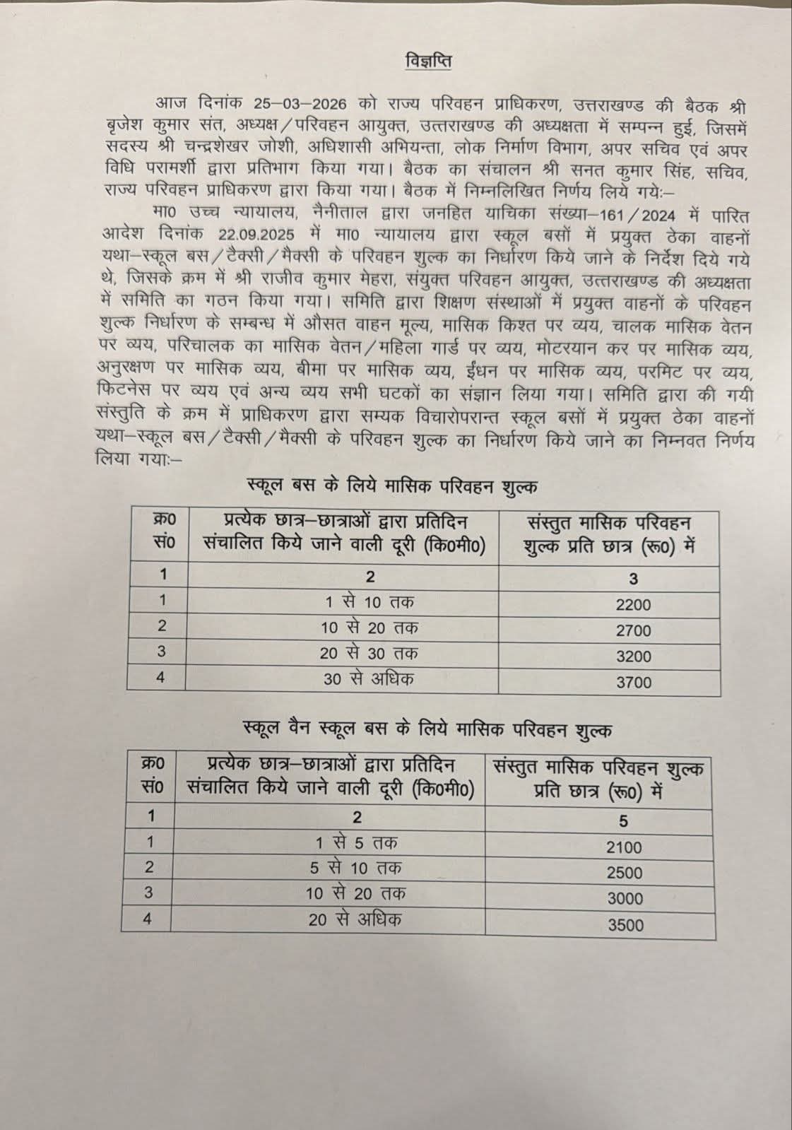 राज्य परिवहन प्राधिकरण की बैठक में उत्तराखंड हाई कोर्ट के आदेश के क्रम में तय किया गया किराया