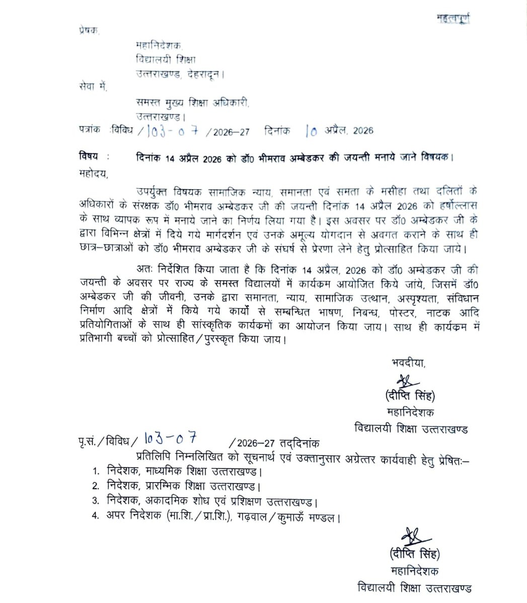 खैर, महानिदेशक विद्यालयी शिक्षा, उत्तराखंड की ओर से जारी आदेश में कहा गया है कि सामाजिक न्याय, समानता और दलितों के अधिकारों के महान संरक्षक भारत रत्न डॉ. भीमराव अंबेडकर की जयंती राज्य के सभी विद्यालयों में व्यापक रूप से आयोजित की जाए। आदेश के अनुसार, स्कूलों में डॉ. अंबेडकर के जीवन, उनके संघर्ष और संविधान निर्माण में उनके अमूल्य योगदान पर आधारित विभिन्न कार्यक्रम आयोजित किए जाएंगे।