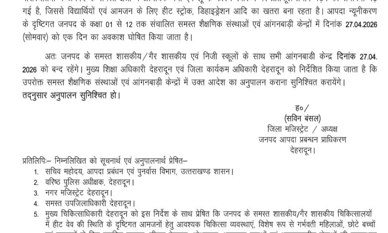 Rajkumar Dhiman, Dehradun: जनपद में लगातार बढ़ते तापमान और लू (हीट वेव) के खतरे को देखते हुए जिला प्रशासन ने बड़ा फैसला लिया है। जिलाधिकारी एवं अध्यक्ष, जिला आपदा प्रबंधन प्राधिकरण के आदेशानुसार 27 अप्रैल 2026 (सोमवार) को देहरादून जिले के सभी सरकारी, गैर-सरकारी और निजी स्कूलों के साथ-साथ आंगनबाड़ी केंद्रों में अवकाश घोषित किया गया है।